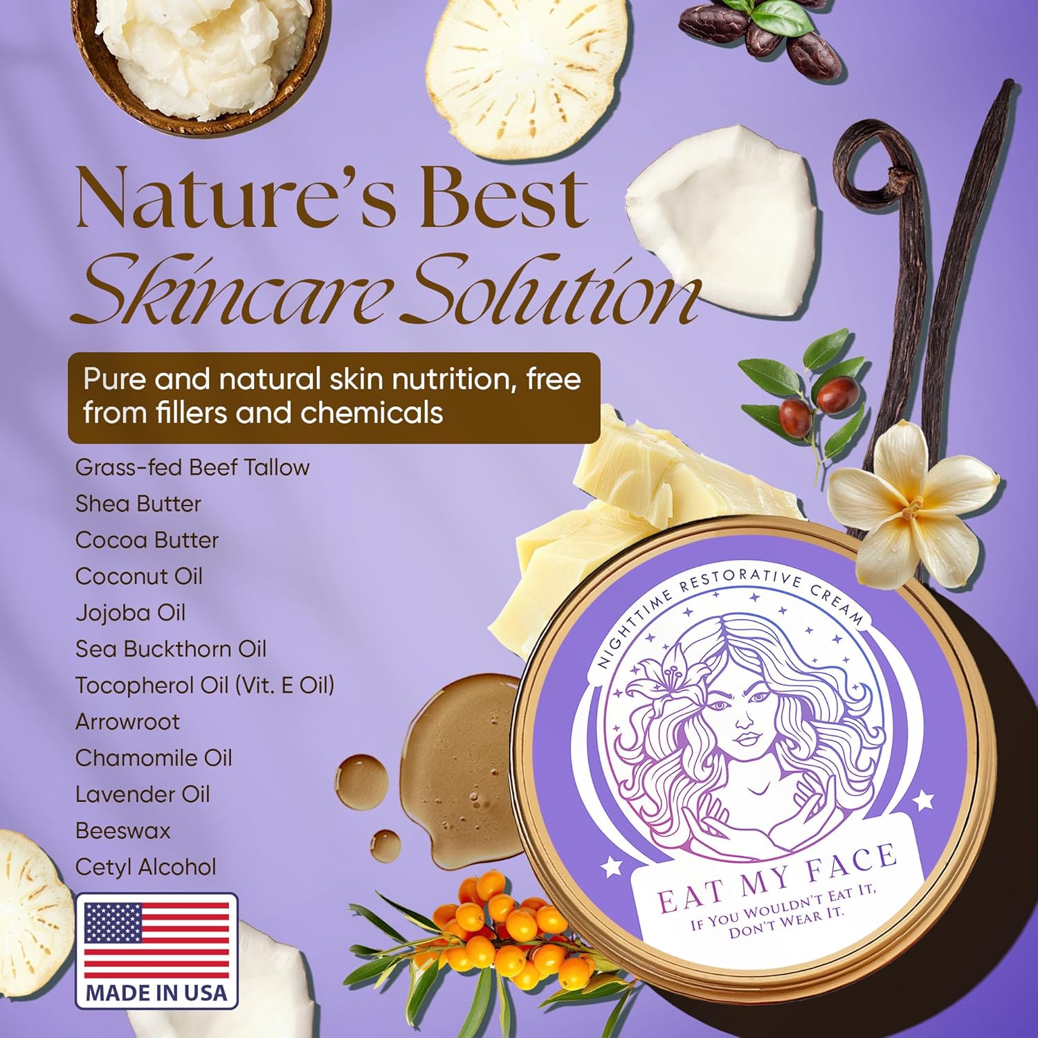 Grass-fed tallow, Non-Nano Zinc Oxide, Cocoa Butter, Vitamin E, Sea Buckthorn, Jojoba Oil, MCT oil, Arrowroot Powder, Vanilla Oil