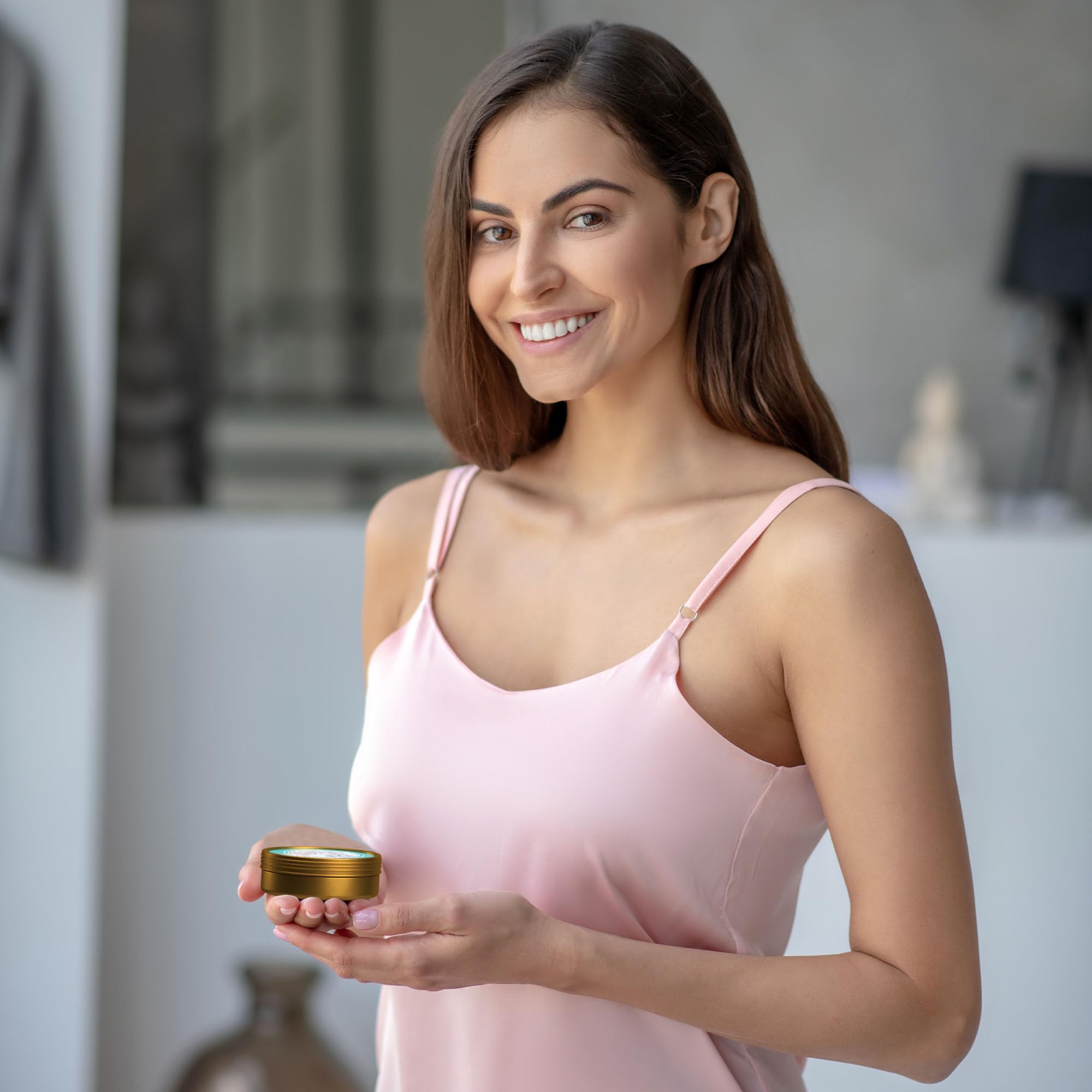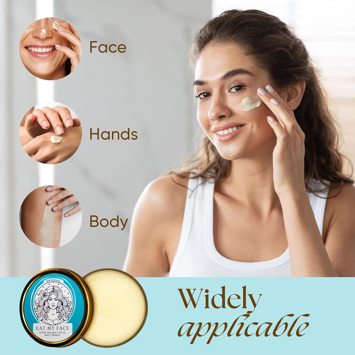 Scoop a small amount, warm it between your fingertips, and press into your face and body. A little goes a long way. It melts in fast and leaves skin soft, smooth, and comfortable — not greasy.